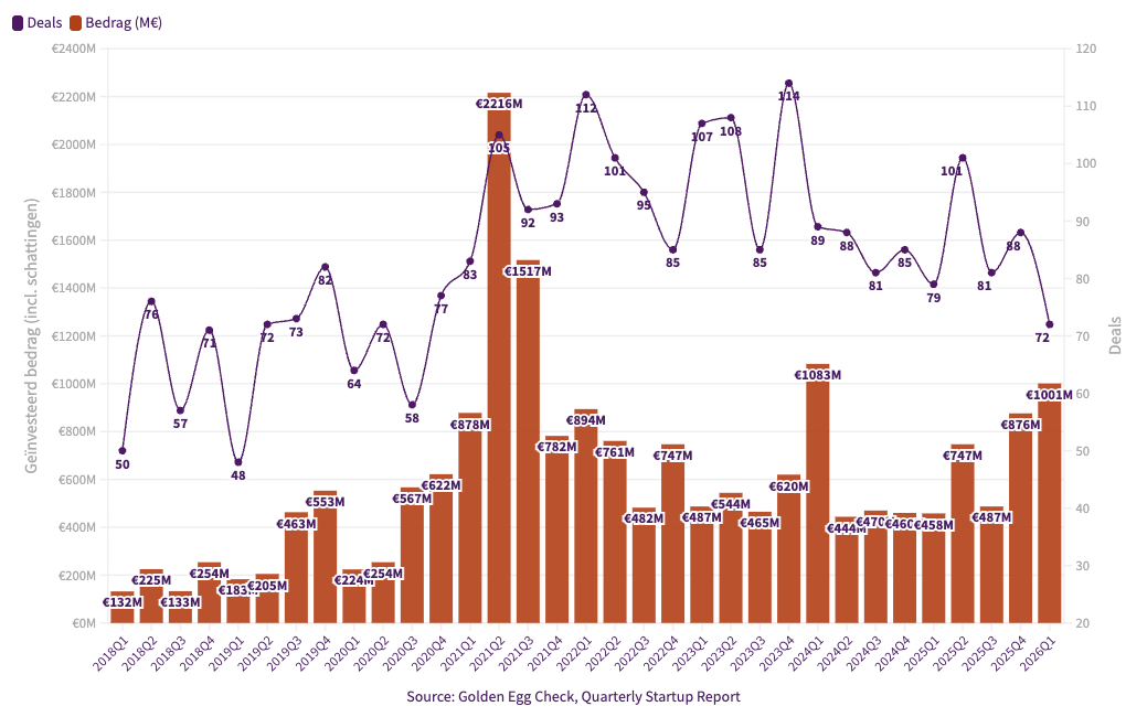 Op basis van schattingen voor niet-gepubliceerde bedragen komt het totaal voor het eerste kwartaal van 2026 uit op circa 1 miljard, zo blijkt uit de laatste editie van het Quarterly Startup Report, een driemaandelijkse data-analyse van Dealroom.co, Golden Egg Check, KPMG, Invest-NL, de Regionale Ontwikkelingsmaatschappijen (ROM’s), Nederlandse Vereniging van Participatiemaatschappijen (NVP) en Techleap onder leiding van Dutch Startup Association (dSa).